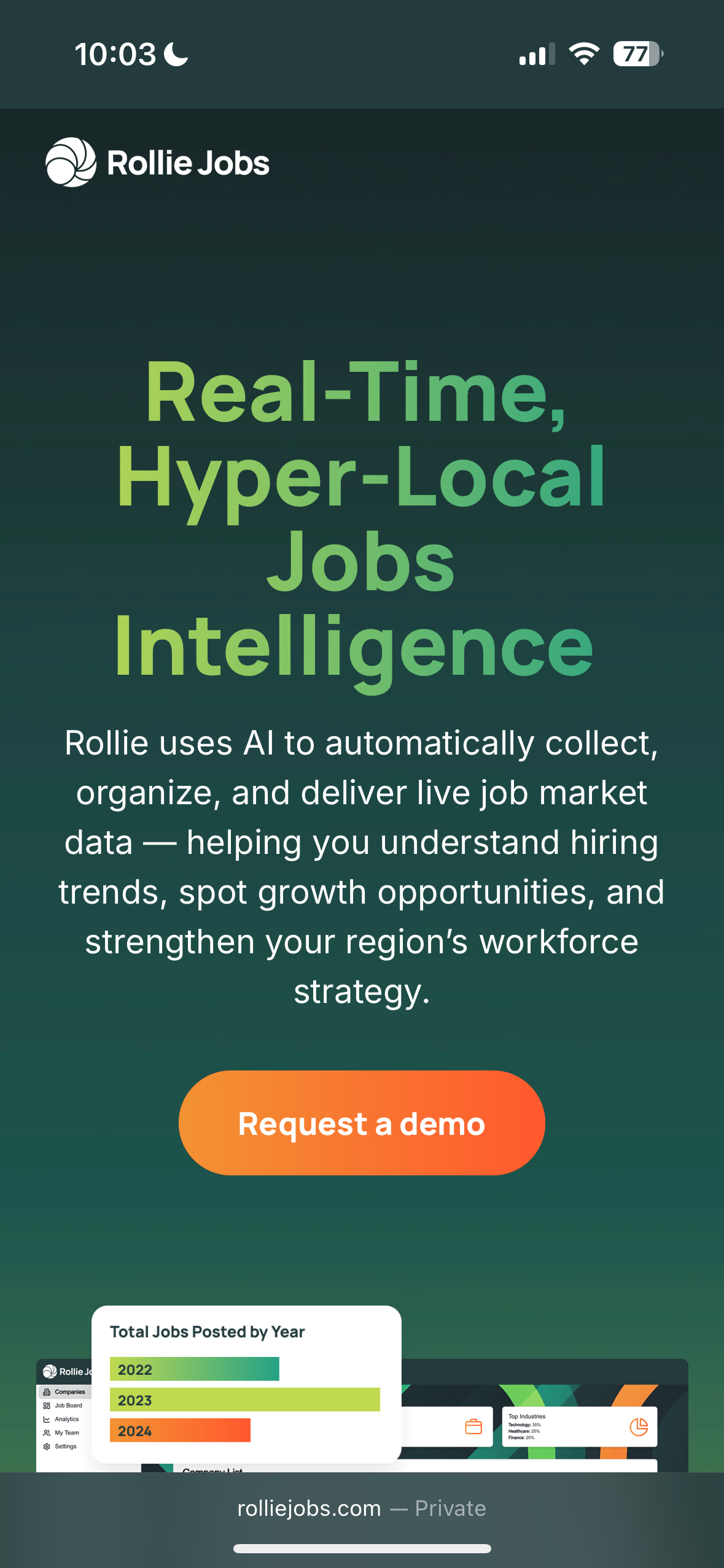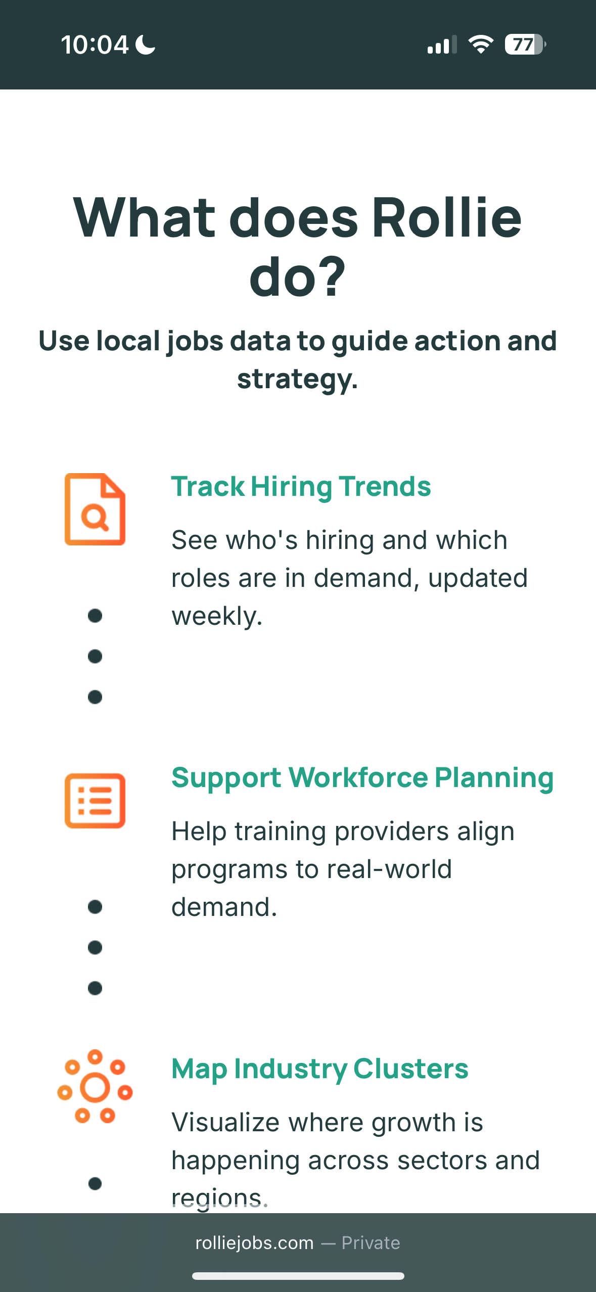 I partnered with CodeWorks and Rollie Jobs, a platform that uses AI to collect and organize real-time job data for communities, to design a modern website that highlights the product’s value and regional impact.