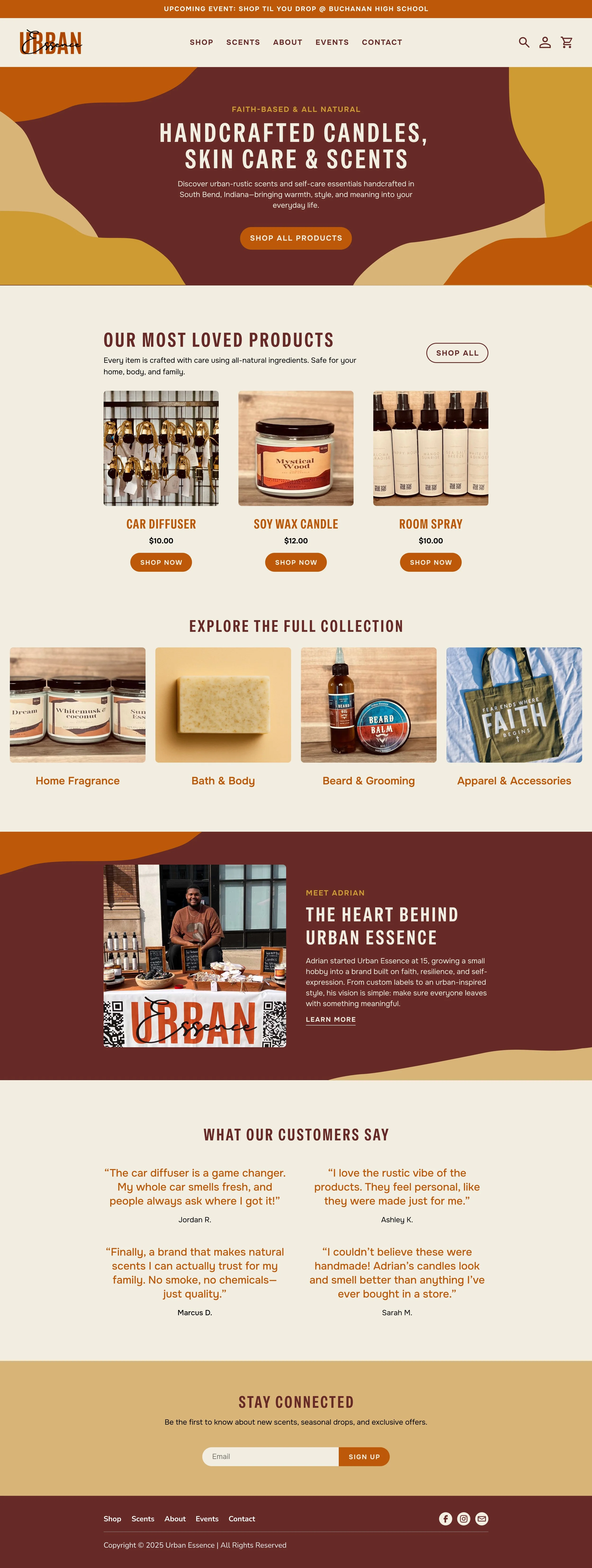I partnered with Urban Essence, a handcrafted lifestyle brand offering candles, body care, and apparel, to design and build a custom e-commerce website on Square that reflects the brand’s urban-rustic aesthetic and faith-based roots.