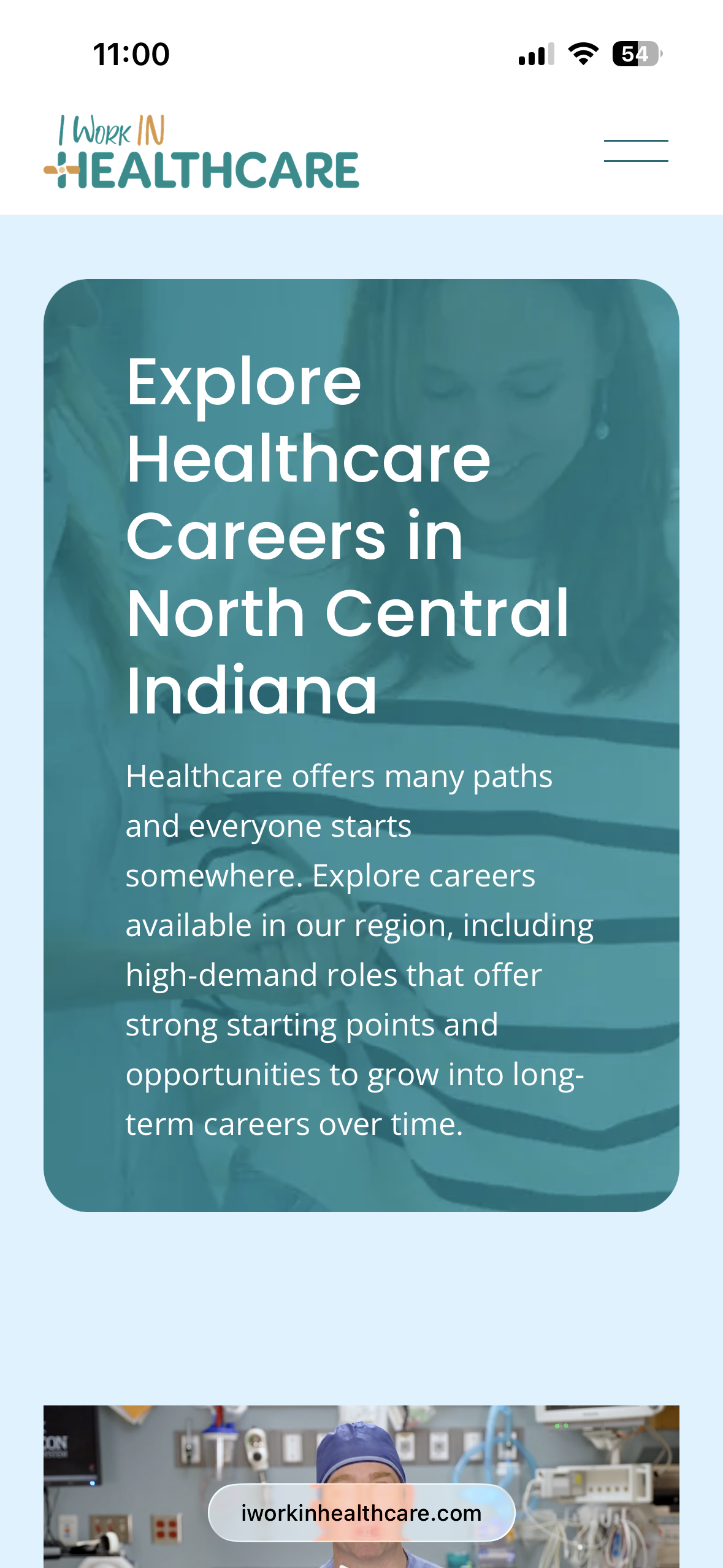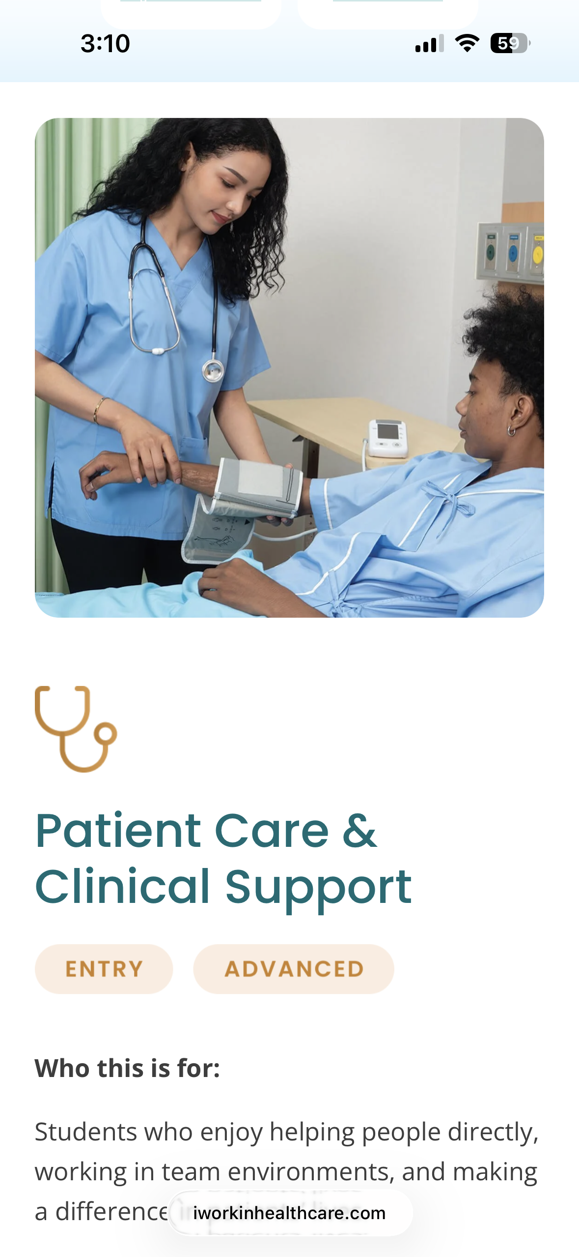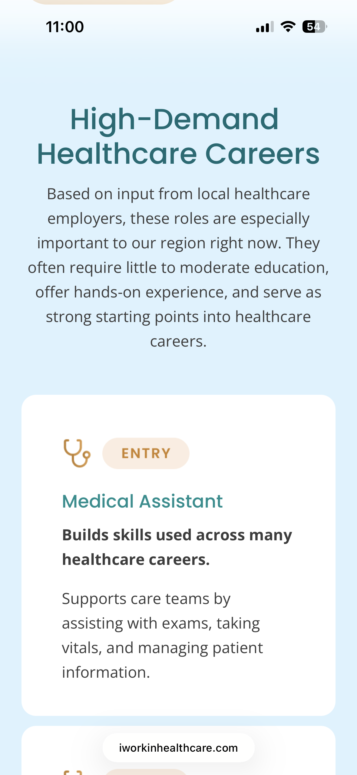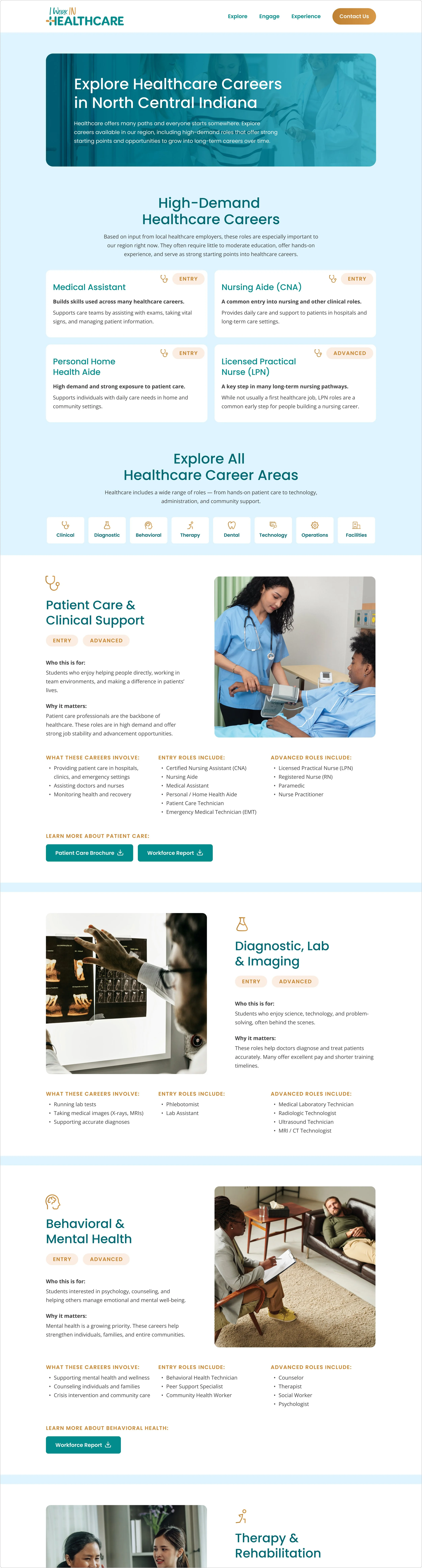 In addition to building the site, I helped structure a clear Explore → Engage → Experience framework and developed a cohesive visual and content system, making it easier for users to understand their options and take the next step into healthcare careers.