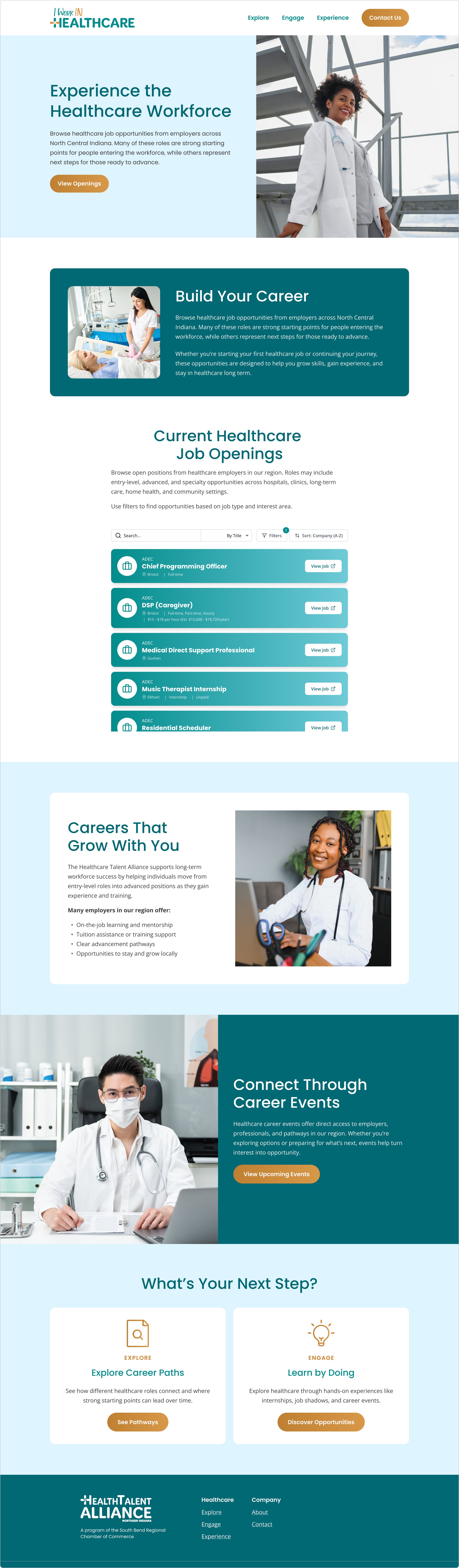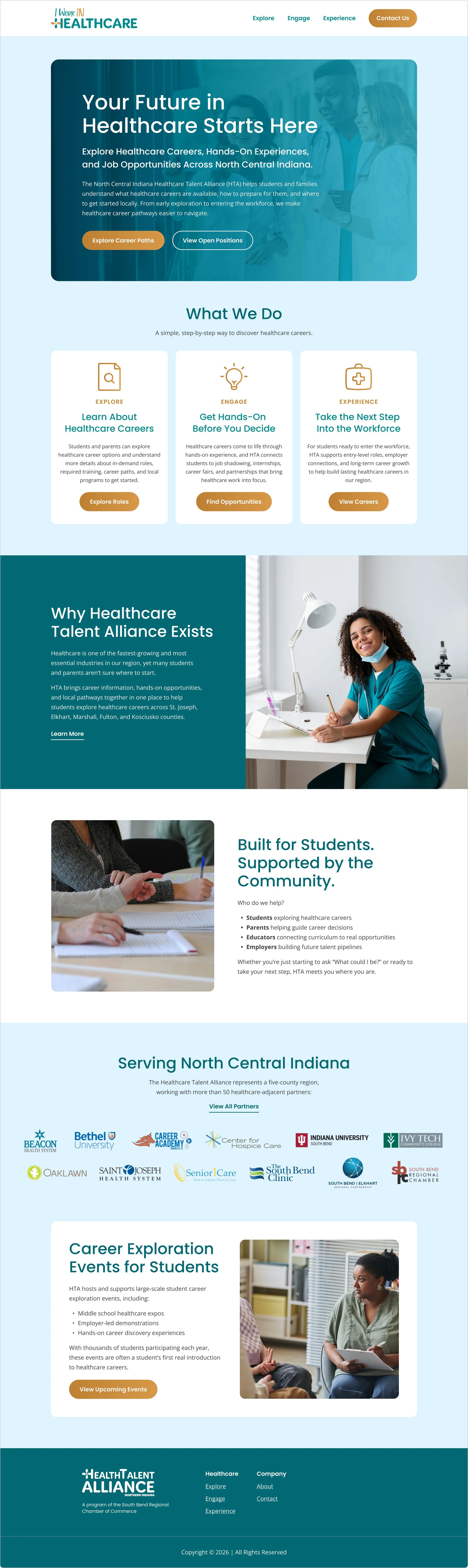 I worked with the North Central Indiana Health Talent Alliance (HTA) to design and develop a modern, student-focused website that supports healthcare career exploration across the region. The new site communicates HTA’s mission, highlights career pathways, and connects students and families to hands-on opportunities, events, and entry-level roles.