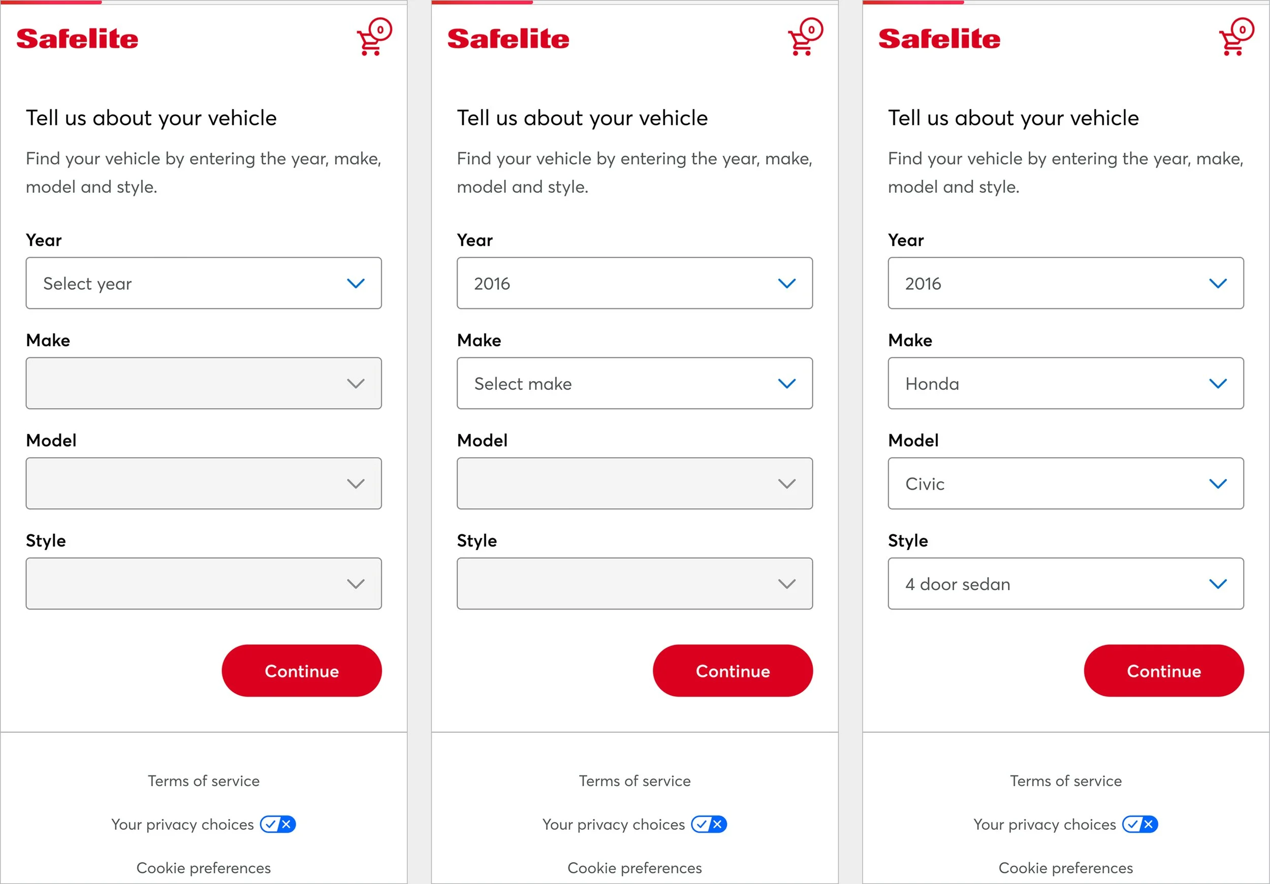 Vehicle selection screens