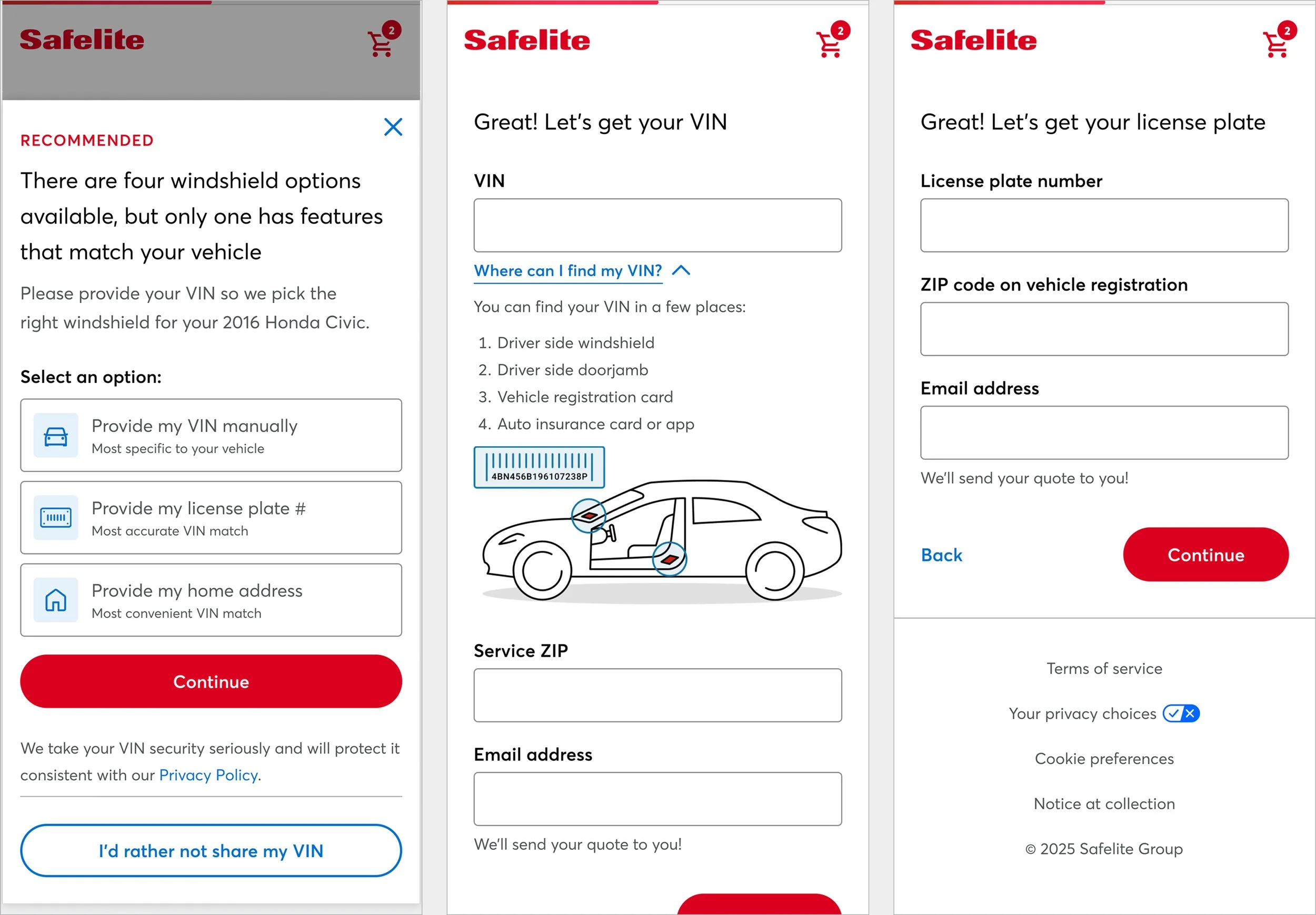 VIN collection screens and license plate experience details